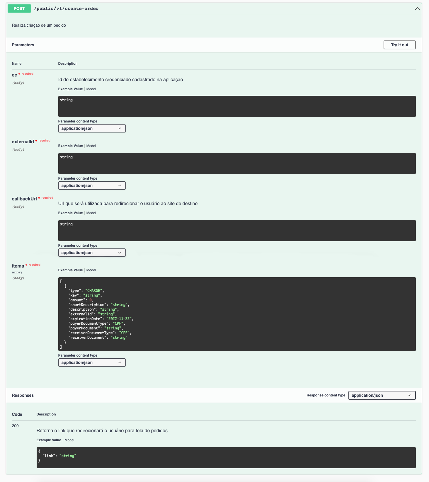 Response – CreateOrder – Retorna o link que redirecionará o usuário à tela de pedidos.